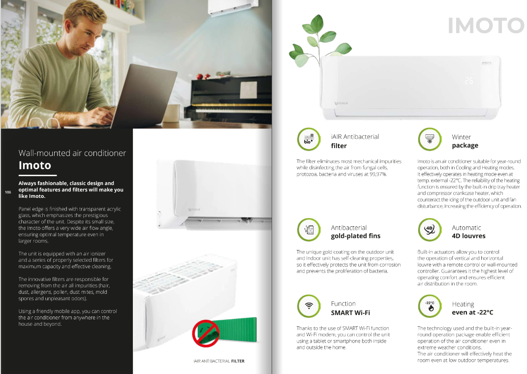 Designul modern al unității interne se integrează elegant în orice decor, iar funcțiile inteligente asigură confort optim în orice anotimp.